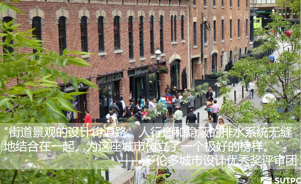 多伦多市场街(Market Street),采用零高差路面、可装卸分隔柱等设计手法,冬季街道用于人车的基本通行以及车辆停放,夏季增设餐厅外摆空间,人行道向机动车道拓展。