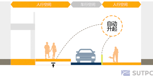 可升降地面,工作日降低供车辆通行,假日升起作为商业外摆或步行空间[1]。